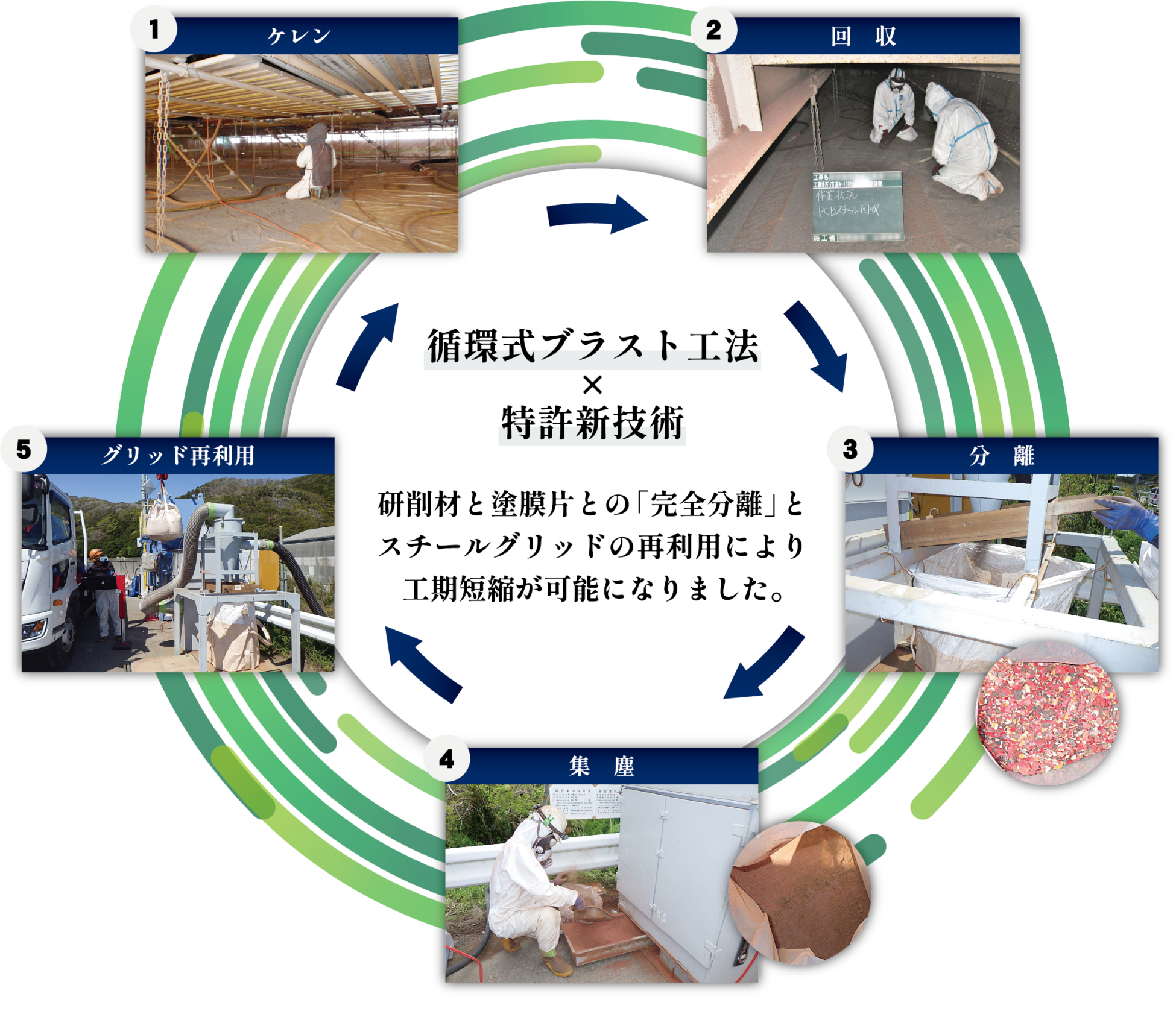 エコーナシステム℠ は、従来型乾式ブラスト工法に比べ、分離後に研削材を再利用するため、廃棄物の処理・運搬に掛かる費用を大幅に抑える事が出来ます。